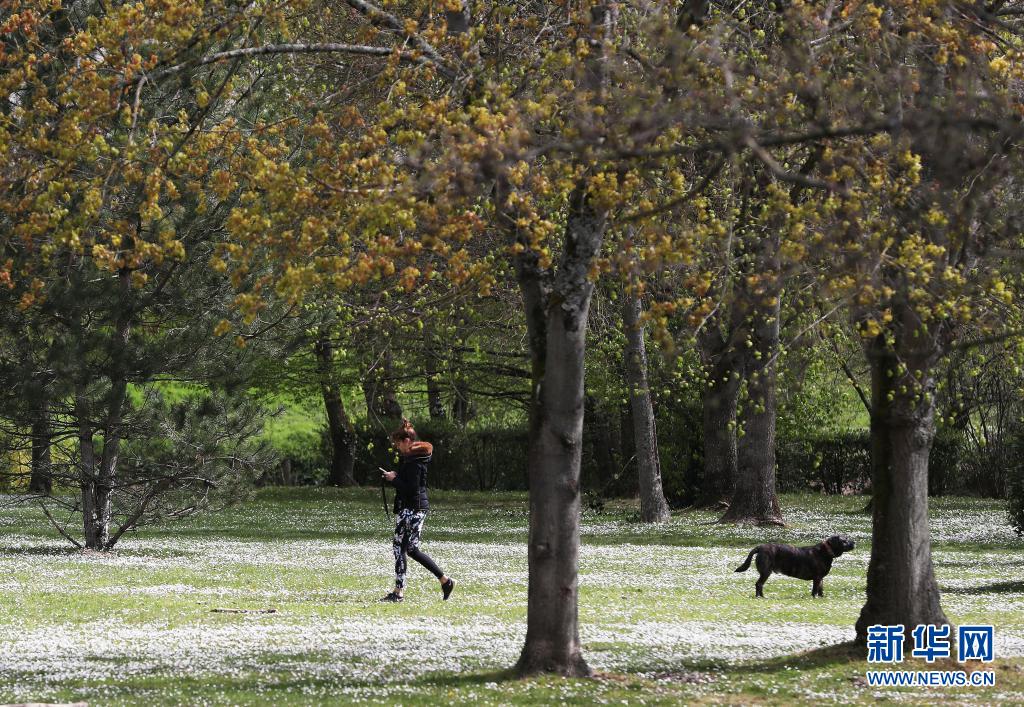 4月8日,一名女子在法国蒙达尔纪的一处公园遛狗。新华社记者 高静 摄