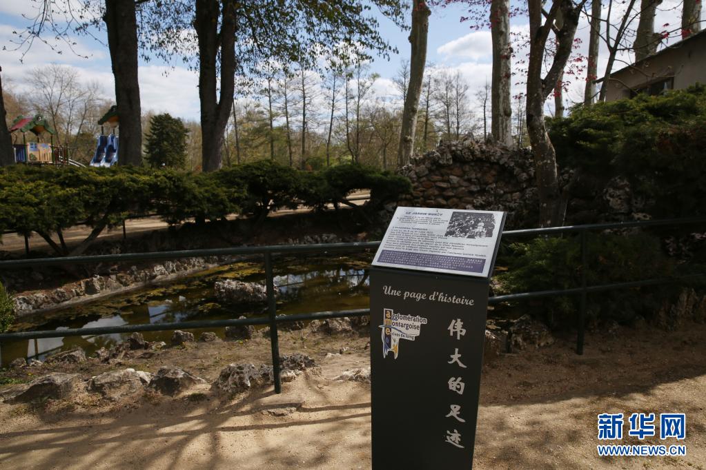 4月8日,法国蒙达尔纪独吉公园(又译杜吉公园)一块指示牌展示当年中国勤工俭学青年们的红色足迹。1920年7月,蔡和森、向警予等旅法新民学会会员在独吉公园召开会议,讨论改造中国与世界的方法,并提出建立一个新民主主义政党的主张。新华社记者 高静 摄